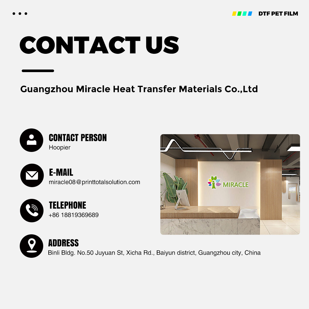 Guangzhou Miracle Print Technology Inc with over 10 year experience in printing business, specialized in producing heat transfer materials and PET film. We are a production-oriented heat transfer materials factory integrated with R&D, manufacture, sales and service into one. Our PET film is manufactured by imported high-quality PET base film and combined with unique coating technology, which adapt to the majority of ink on the market. We are running a dust-free workshop and have introduced 3 advanced high-speed coating production lines, computer micro-controlled coating machines, a complete set of coating equipment such as slitting, slicing inspection, to strictly control production standards,monthly production capacity up to 50,000 rolls. The PET film is qualified with multiple EU (Oeko-Tex Standard 100), SGS, and lSO. Our company has gathered a core team with many years of sales and production experience in printing industry. lt can provide stable and high-guality products to meet the needs of users and agents. At the same time, it proposes personalized supporting solutions for customers to enhance their market competitiveness and truly realize the perfect combination of products and concepts.